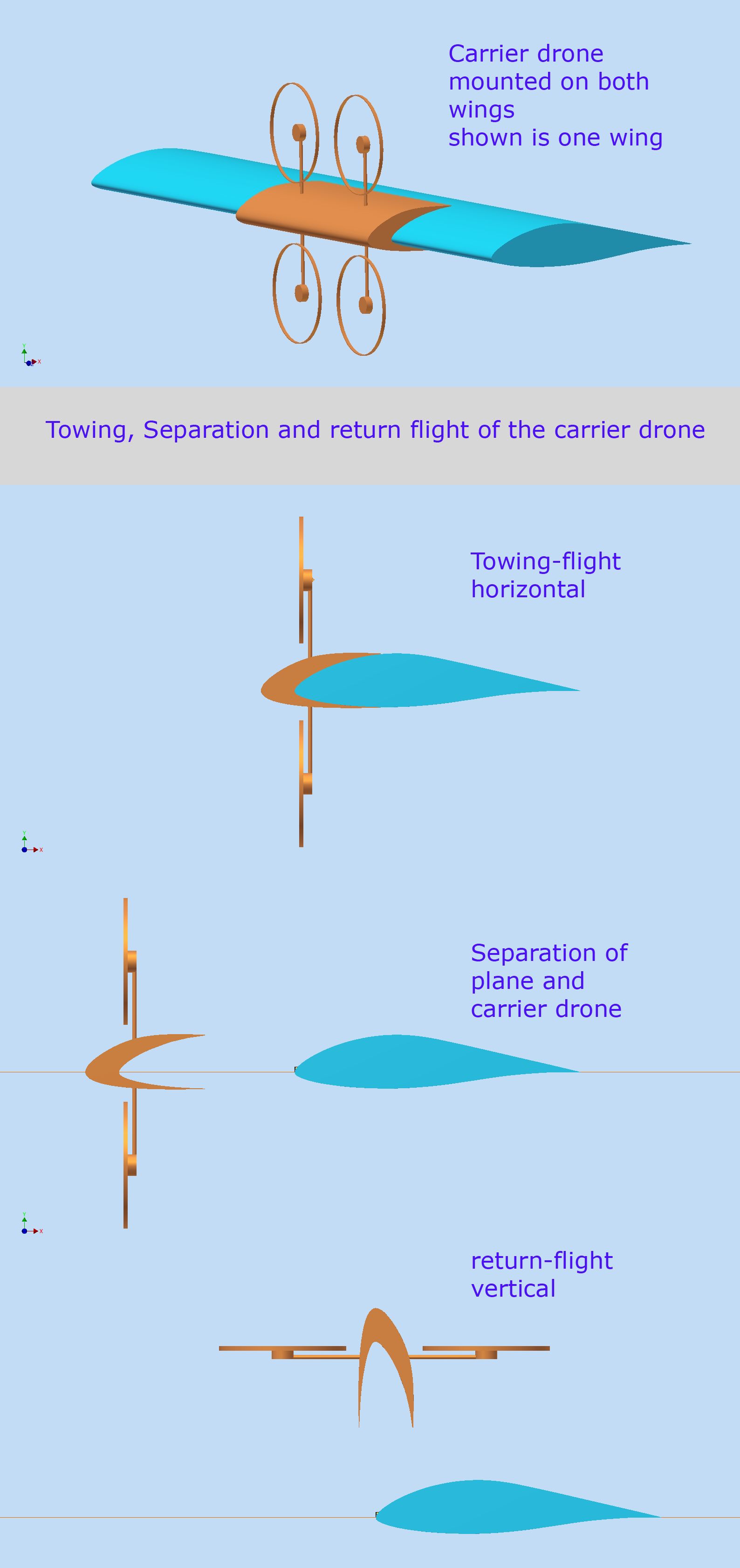 One step furhter is the idea of the carrier drone or tow drone. This propulsion unit simply separates from the airplane. A normal tow plane is therefor a kind of manned carrier drone.